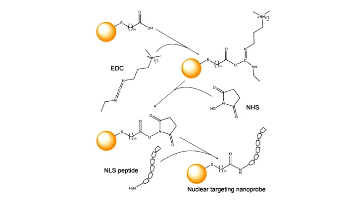 2009年,Xie等人证明了核定位信号(NLS)肽功能化的金纳米颗粒可用作核靶向纳米探针。首先用11-巯基十一酸(11-MUA)对纳米颗粒进行修饰,然后通过碳二亚胺偶联将NLS肽连接到修饰后的金纳米颗粒上(图2)。Bartczak及其同事开发了一种一锅合成法,使用EDC/磺基-NHS(N-羟基琥珀酰亚胺)偶联将肽KPQPRPLS偶联到羧基末端封端的聚乙二醇金纳米颗粒(OEGNPs)上。肽偶联的程度受实验参数的影响,例如反应时间、试剂浓度和纳米晶体的形态。