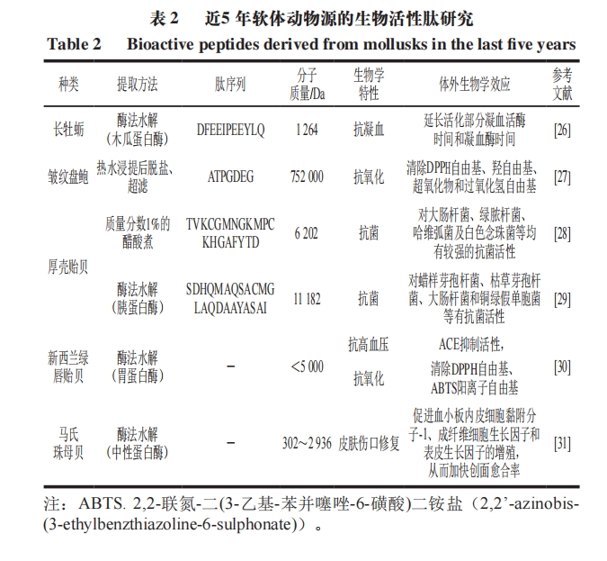 海洋活性肽具有抗动脉粥样硬化、抗癌、抗凝血、抗糖尿病、抗炎、抗高血压、抗菌和抗氧化的活性,其中抗高血压和抗氧化活性被广泛研究。从藻类中分离得到的抗癌和抗菌肽(antimicrobial peptides,AMPs)较少,抗菌和抗炎肽常源于软体动物。此外,一些研究结果显示了多肽往往同时具有多种生物活性,如常同时具备抗氧化和抗高血压作用。